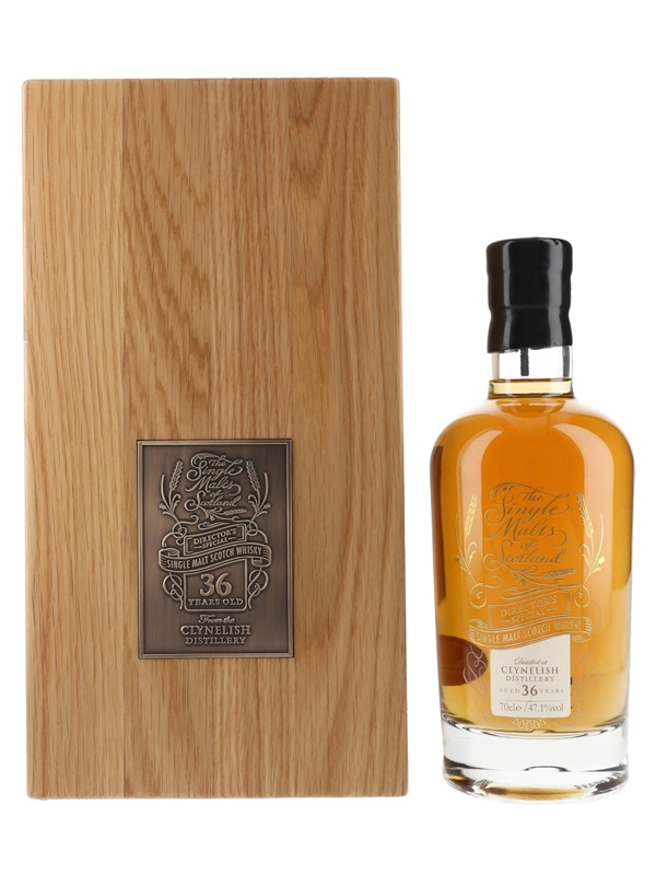 A bottle of Clynelish 36 Year Old Director's Special Single Malt Scotch Whisky, presented in a wooden case. This was matured in a single refill hogshead and bottled at cask strength by Elixir Distillers as part of The Single Malts of Scotland series.