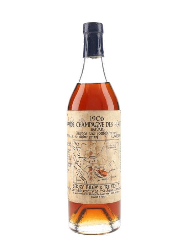A bottle of 1906 Grande Champagne des Héritiers Cognac. This was shipped and bottled in 1967 by Berry Brothers & Rudd.