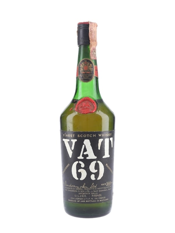 A bottle of Vat 69 Finest Scotch Whisky, produced by Wm Sanderson & Son Ltd. This was bottled for Italian importer Silver, we estimate in the late 1960s to early 1970s.