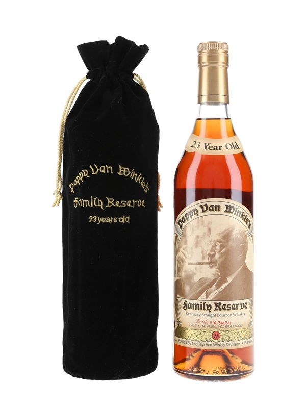A bottle of Pappy Van Winkle's 23 Year Old Family Reserve Kentucky Straight Bourbon Whiskey, bottled by Old Rip Van Winkle Distillery, Frankfort. The bottling code indicates this was bottled in 2019.