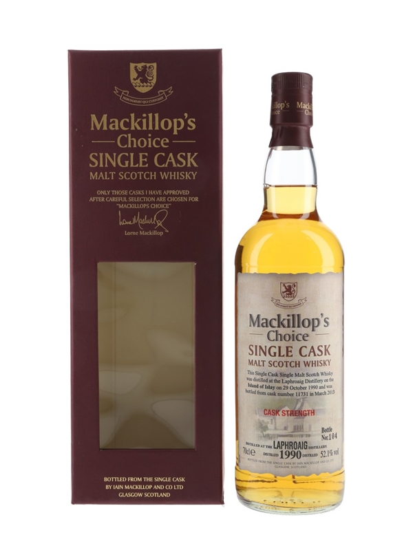 A bottle of Laphroaig 1990 Single Malt Scotch Whisky. This was distilled on 29 October 1990, matured in a single cask and bottled in March 2013 for the Mackillop's Choice range.
