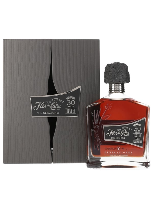A bottle of Flor de Caña V Generaciones 30 Year Old Single Family Estate Rum from Nicaragua. Since 1988, this rum was matured in a single barrel at the base of Nicaragua's most active volcano.