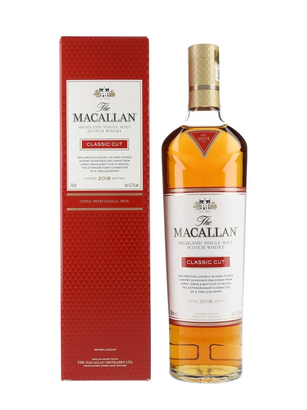 A bottle of The Macallan Classic Cut Limited Edition. This was aged in casks seasoned with oloroso sherry from Jerez, Spain, and bottled by the distillery in 2018.
