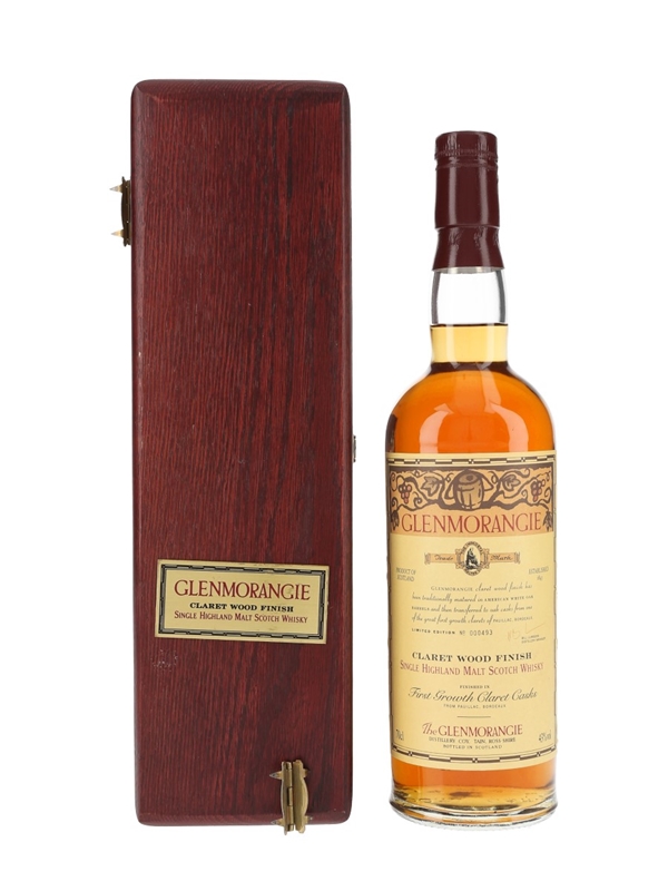 A bottle of Glenmorangie Claret Wood Finish Single Highland Malt Scotch Whisky. In 1989, the distillery selected eight American white oak barrels of vintage Glenmorangie, distilled between 1976 and 1979, and transferred the whisky to casks which previously held First Growth wine from Pauillac, Bordeaux.