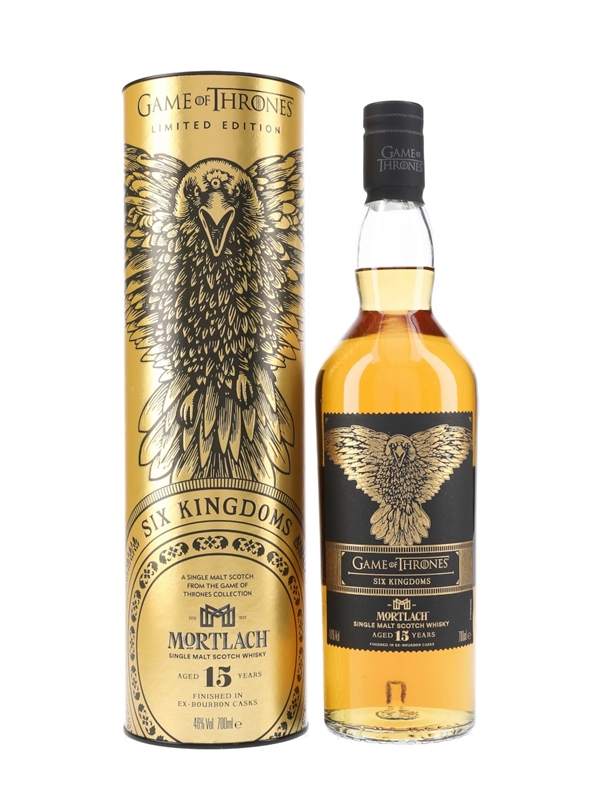 A limited edition bottle of Mortlach 15 Year Old Finished in Ex Bourbon Casks from Diageo's Game of Thrones series. Each of the nine bottles in the series is named for one of the Great Houses of Westeros, The Night's Watch and Six Kingdoms. This edition represents Six Kingdoms.
