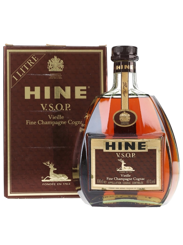 A litre bottle of Hine VSOP Vieille Fine Champagne Cognac. We estimate this was bottled in the 1980s.