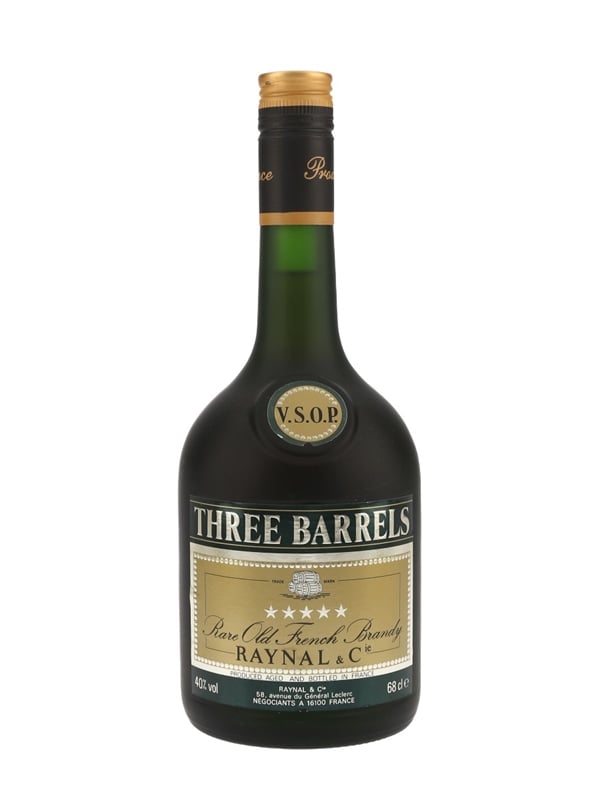 A 68cl bottle of Three Barrels VSOP 5 Star Rare Old French Brandy, produced by Raynal & Co. We estimate this was bottled in the 1990s.