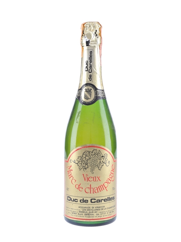 A bottle of Duc de Carelles Vieux Marc De Champagne, produced and bottled by Les Distilleries de la Champagne. This was bottled for the Italian market and imported by Spirit, we estimate in the 1980s to 1990s.