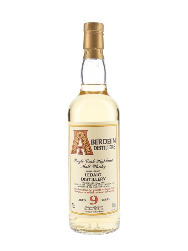 A bottle of Ledaig 9 Year Old Single Cask Highland Malt Whisky. This was distilled in May 1992, matured in a single hogshead and bottled in September 2001 by Blackadder International under the Aberdeen Distillers label.