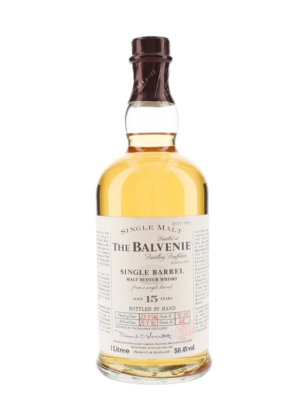 A litre bottle of The Balvenie 15 Year Old Single Barrel Malt Scotch Whisky. This was distilled on 18 July 1980, matured in a single cask and bottled on 23 July 1996.