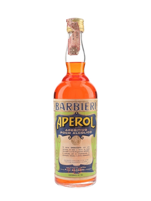 A bottle of Aperol, a liqueur flavoured with rhubarb, gentian, cinchona and other ingredients, produced when the brand was still owned by Barbieri. We estimate this was bottled in the 1970s.