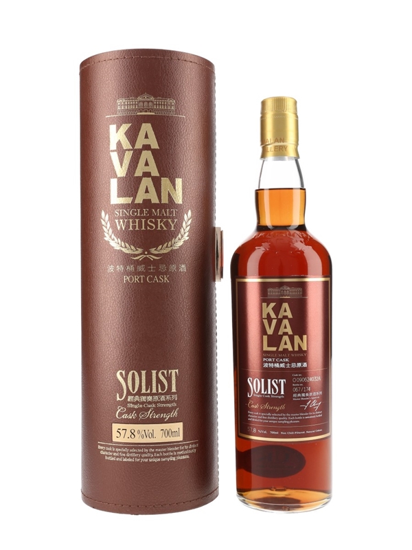 A bottle of Kavalan Solist Port Cask, matured in port casks selected by the distillery's Master Blender. This was distilled in 2009 and bottled from a single cask in 2016