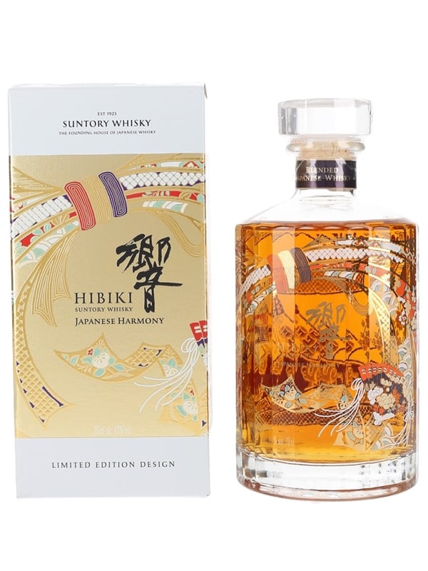 A limited edition bottle of Suntory Hibiki Japanese Harmony released to commemorate the 30th anniversary of the Hibiki blend. The bottle is decorated with the 'tabane-noshi', a traditional Japanese symbol of celebration signifying shared happiness with others.