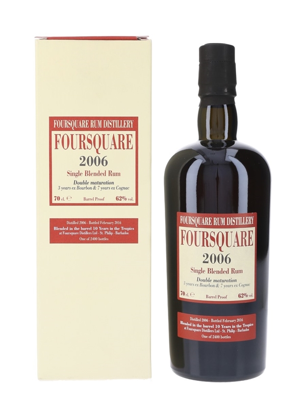 A bottle of Foursquare 2006 Single Blended rum from Barbados. This rum was matured in two types of cask, spending three years in ex-bourbon barrels, and seven years in ex-Cognac casks, before blending and bottling in 2016 by Velier.