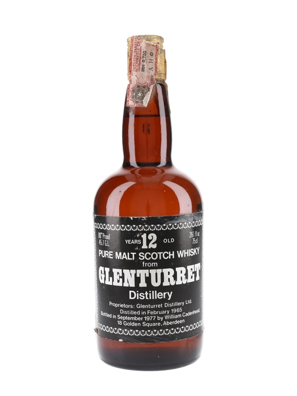 A dumpy bottle of Glenturret Pure Malt Scotch Whisky from independent bottler Cadenhead's, distilled in February 1965.