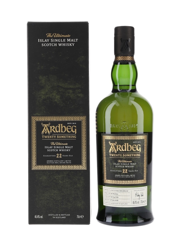 A bottle of Ardbeg Twenty Something The Ultimate Islay Single Malt Scotch Whisky, a 22 Year Old expression distilled in spring 1996, matured in ex-bourbon casks and bottled on 18 July 2018. This is the Special Committee Only Edition and was bottled at 46.4% ABV.