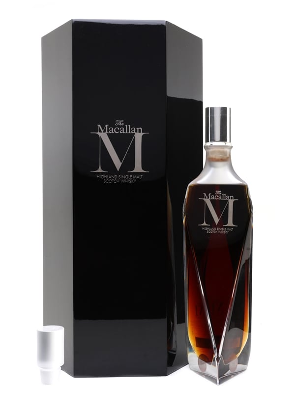 A bottle of The Macallan M Highland Single Malt Scotch Whisky from the distillery's 1824 Series. This is a vatting of malts dating back to the 1940s and is presented in a Lalique crystal decanter designed by Fabien Baron, housed in a mirrored lacquer presentation case.