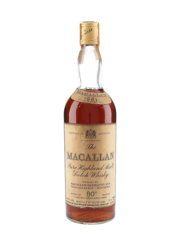 A bottle of The Macallan 1961 Pure Highland Malt Scotch Whisky, bottled by Campbell, Hope & King. This was bottled for the Italian market and imported by Rinaldi, we estimate in the 1970s.
