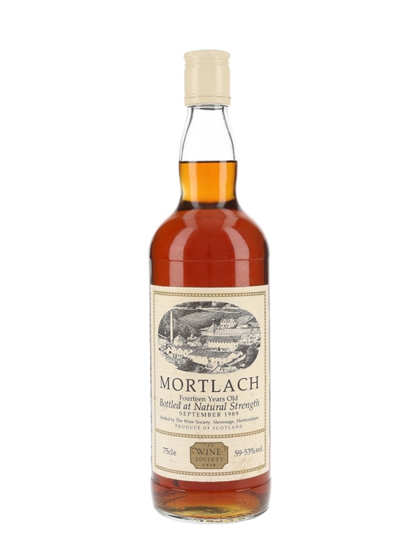 A bottle Mortlach 14 Year Old Single Malt Scotch Whisky. This was purchased by The Wine Society in 1975 and matured in one of its own sherry casks. It was bottled at 59.53% ABV in September 1989.