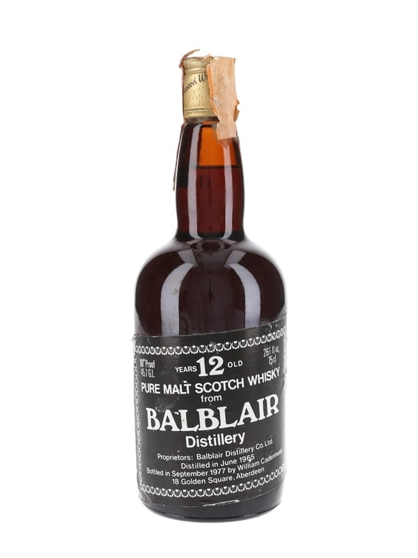 A bottle of Balblair 12 Year Old Pure Malt Scotch Whisky. This was distilled in June 1965, bottled in September 1977 by Wm Cadenhead and imported to Italy by Mario Rossi.