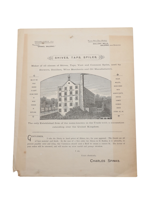 Shives, Taps, Spiles, a two page advert and price list from Charles Spinks, Wood Merchant, 'maker of all classes of Shives, Taps, Vents and Common Spiles, used by Brewers, Distillers, Wine Merchants and Oil Manufacturers'.