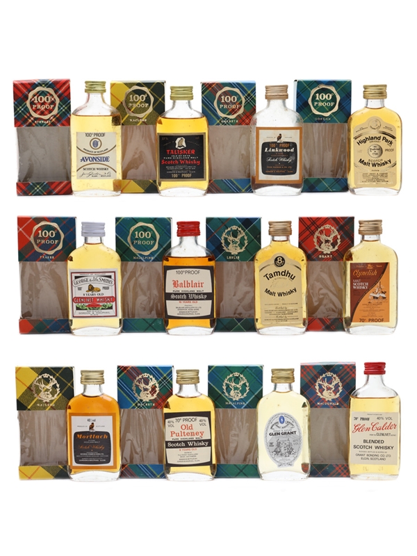 A set of 12 miniature bottles of Blended and Single Malt Scotch Whisky, bottled at 70 Proof and 100 Proof by Gordon & MacPhail and presented in a Fortnum & Mason gift box. We estimate these were bottled in the 1970s: