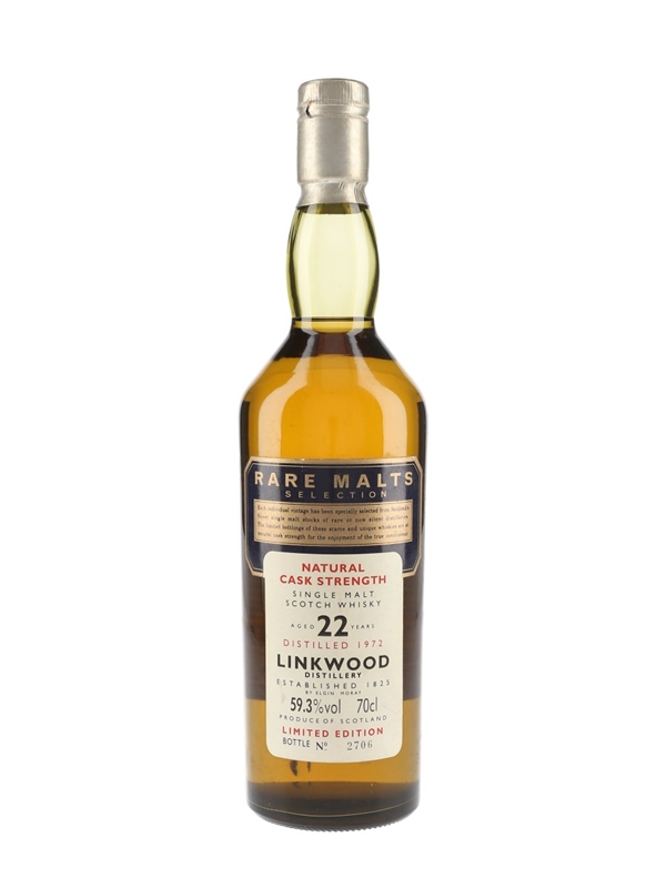 A bottle of Linkwood 22 Year Old Single Malt Scotch Whisky. This was distilled in 1972 and bottled for Diageo's now-discontinued Rare Malts Selection.