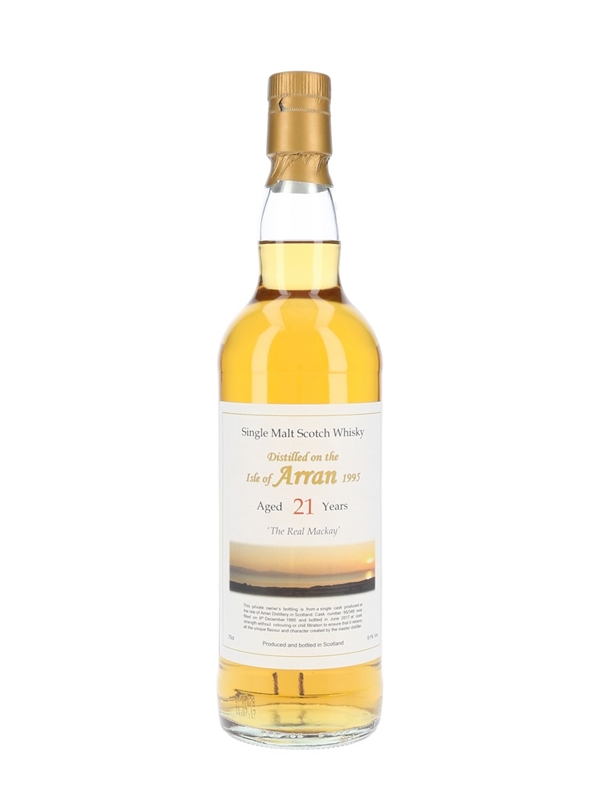 A private cask bottling of The Arran 21 Year Old Single Malt Scotch Whisky. This was distilled on 6 December 1995, matured in a single cask, and bottled at cask strength in June 2017 under the name The Real Mackay.