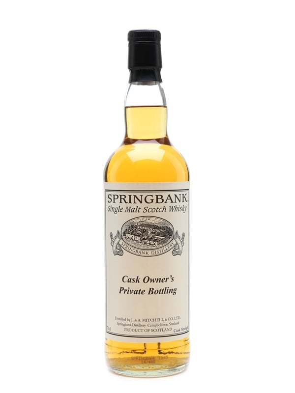 A bottle of Springbank from a private owner's cask. This was distilled in 1993, aged in a remake sherry cask, and bottled at cask strength in October 2014.