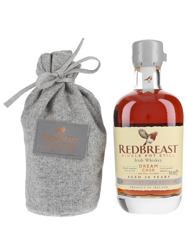 A 50cl bottle of Redbreast 28 Year Old Dream Cask Single Pot Still Irish Whiskey. This was matured in a combination of ruby port, oloroso sherry and bourbon casks, before marrying and re-casking into a ruby port cask. This was bottled at a cask strength of 51.5% ABV.