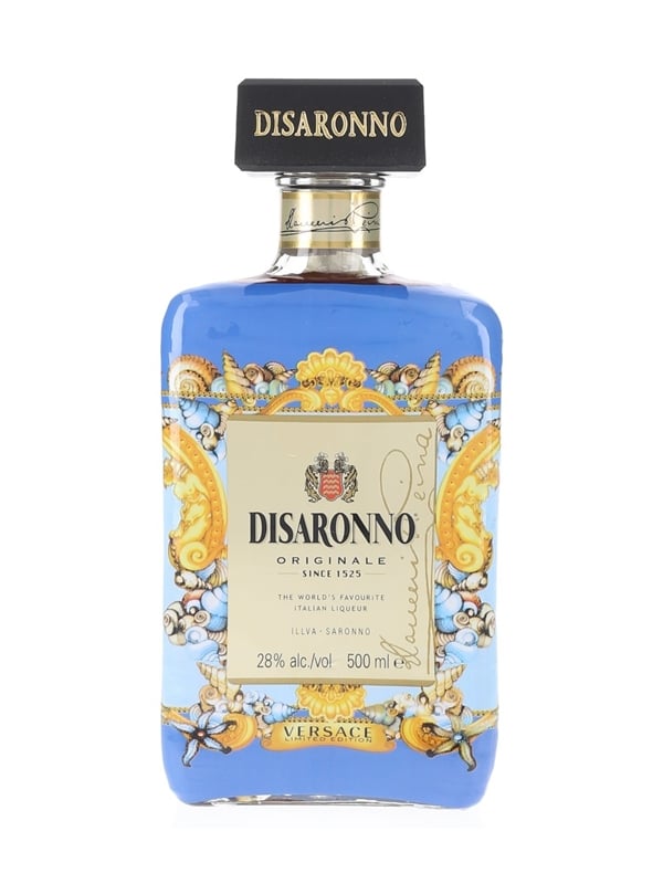 A limited edition 50cl bottle of Disaronno Originale Liqueur, with packaging designed by Italian fashion house Versace.