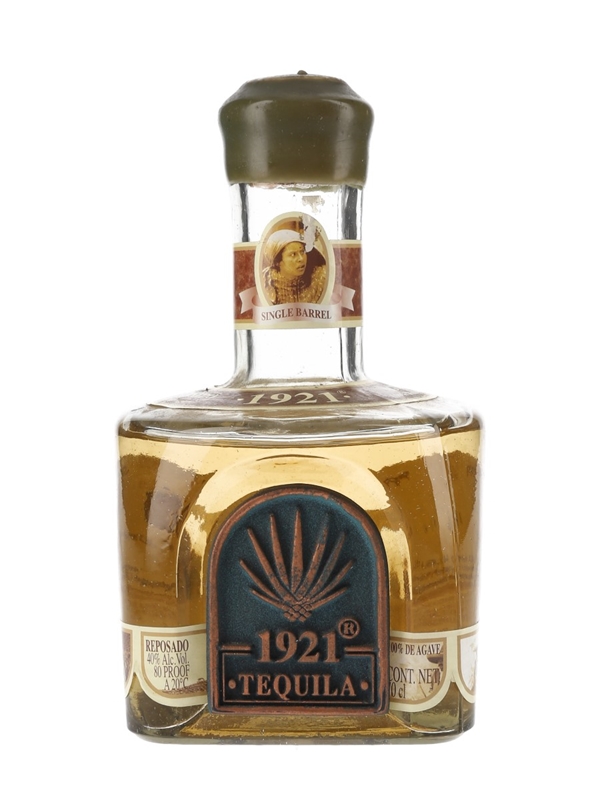 A bottle of 1921 Reposado Single Barrel Tequila from Mexico, made from 100% agave.