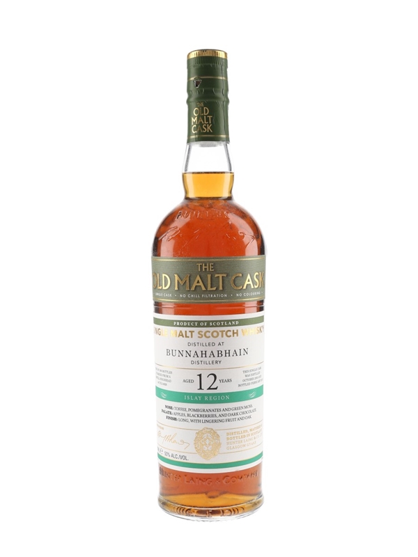 A bottle of Bunnahabhain 12 Year Old Single Malt Scotch Whisky, bottled for Hunter Laing's Old Malt Cask range. This was distilled in October 2005, matured in a refill hogshead and bottled in February 2018.