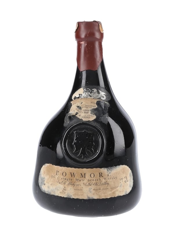 A bottle of Bowmore Islay Single Malt Scotch Whisky, released in 1979 to celebrate the distillery's Bicentenary. This whisky is a vatting of 10 vintages between 1950 and 1966, and was matured mainly in sherry casks.