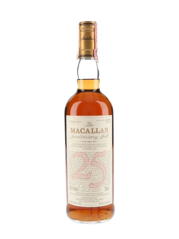 A bottle of The Macallan 1962 Single Highland Malt Scotch Whisky. This was matured in sherry casks for 25 years and bottled in 1988 as part of the Anniversary Malt series. This was produced for the Italian market and imported by Giovinetti & Figli.