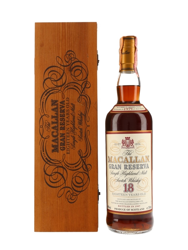 A bottle of The Macallan Gran Reserva 18 Year Old Single Malt Scotch Whisky. This was distilled in 1979, matured in sherry casks and bottled in 1997.