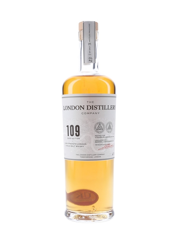 A bottle of The London Distillery Company 109 Cask Edition single malt whisky. This was produced from Plummage Archer barley using 1920s distiller and Whitbread B yeast. The whisky was filled in to 20 litre ex-bourbon casks on 9 September 2015, and matured for three years before bottling at cask strength.