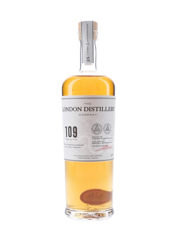 A bottle of The London Distillery Company 109 Cask Edition single malt whisky. This was produced from Plummage Archer barley using 1920s distiller and Whitbread B yeast. The whisky was filled in to 20 litre ex-bourbon casks on 9 September 2015, and matured for three years before bottling at cask strength.