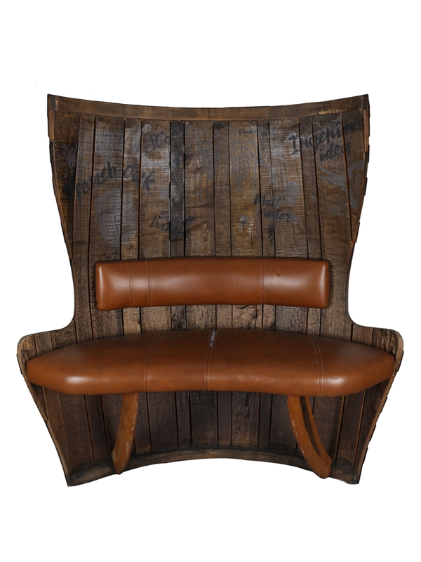 A bench converted from a Glenfiddich barrel, with space to seat two people.