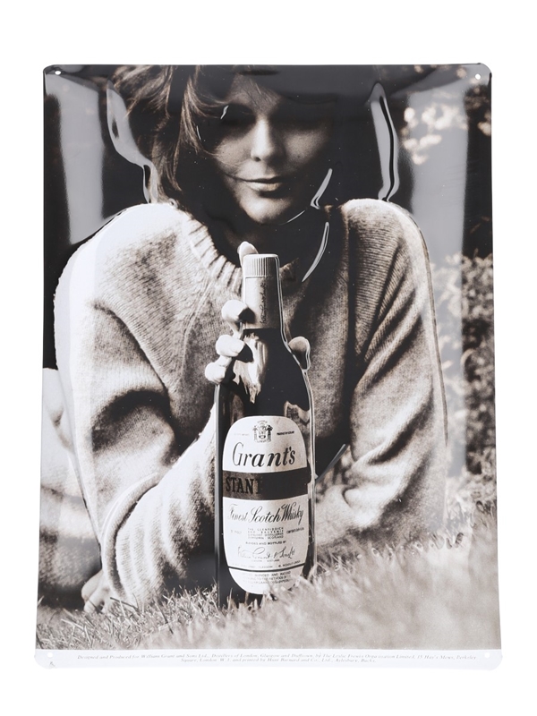 A reproduction Grant's Standfast vintage tin bar sign. This features an image in relief of a woman holding a 1960s era bottle of Grant's Standfast.