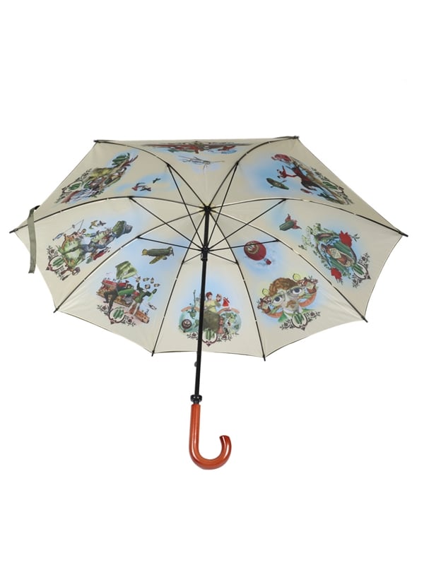 A Hendrick's Gin umbrella decorated with the brand's whimsical Victorian imagery on the underside.