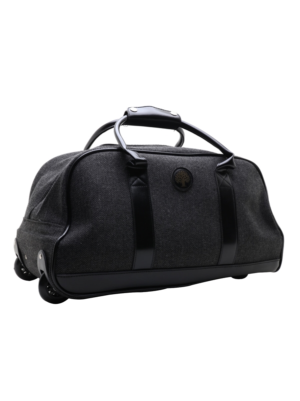 A Grant's branded weekend travel bag, with wheels and an extendable handle.