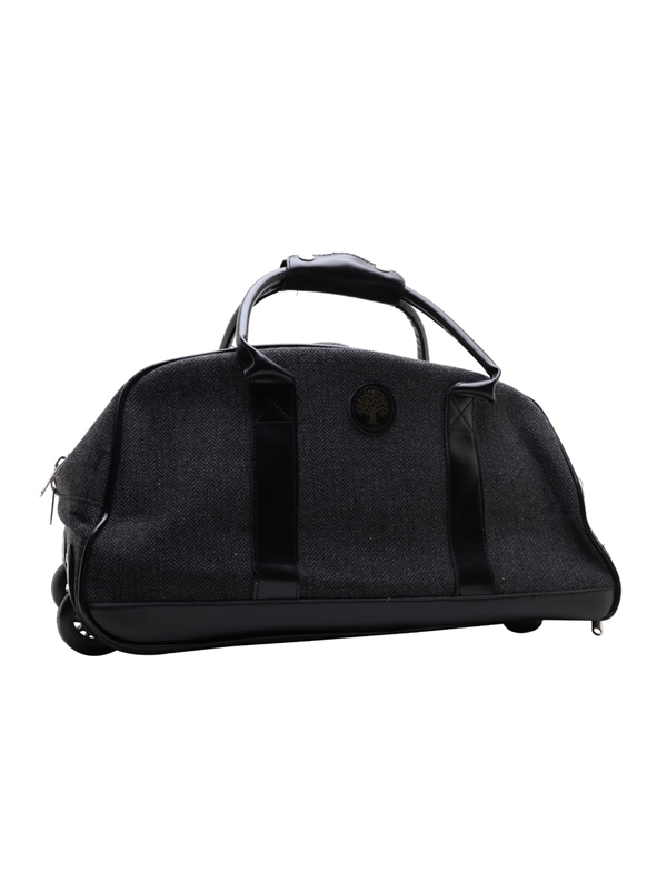 A Grant's branded weekend travel bag, with wheels and an extendable handle.