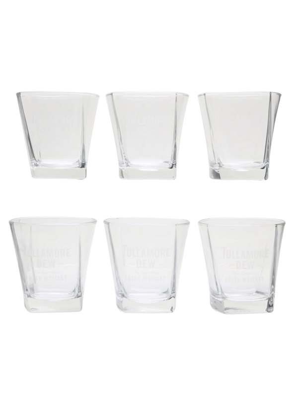 A set of six Tullamore D.E.W. tumblers in the original cardboard box, perfect for a Tully on the rocks in your home or bar.