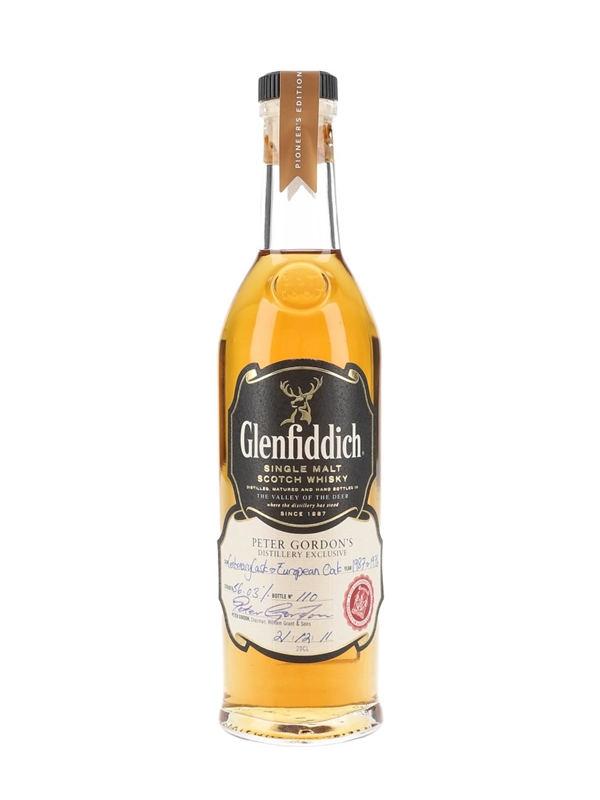 A 20cl bottle of Glenfiddich Peter Gordon's Distillery Exclusive Single Malt Scotch Whisky. This was matured in a Centenary cask from 1987 and a European oak cask from 1976 and bottled in 2011.