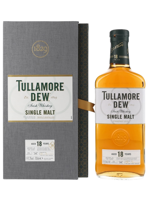 A special edition bottle of Tullamore D.E.W. 18 Year Old Irish Single Malt Whiskey, finished for up to six months in oloroso sherry, port, Madeira and bourbon casks.