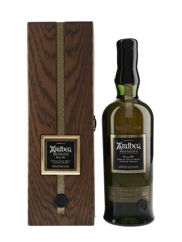 A bottle of Ardbeg Provenance Very Old Single Islay Malt Scotch Whisky. This was distilled in 1974, one of the last years that Ardbeg's maltings were fully operational, and bottled on 9 April 1998 at cask strength of 54.7% ABV.