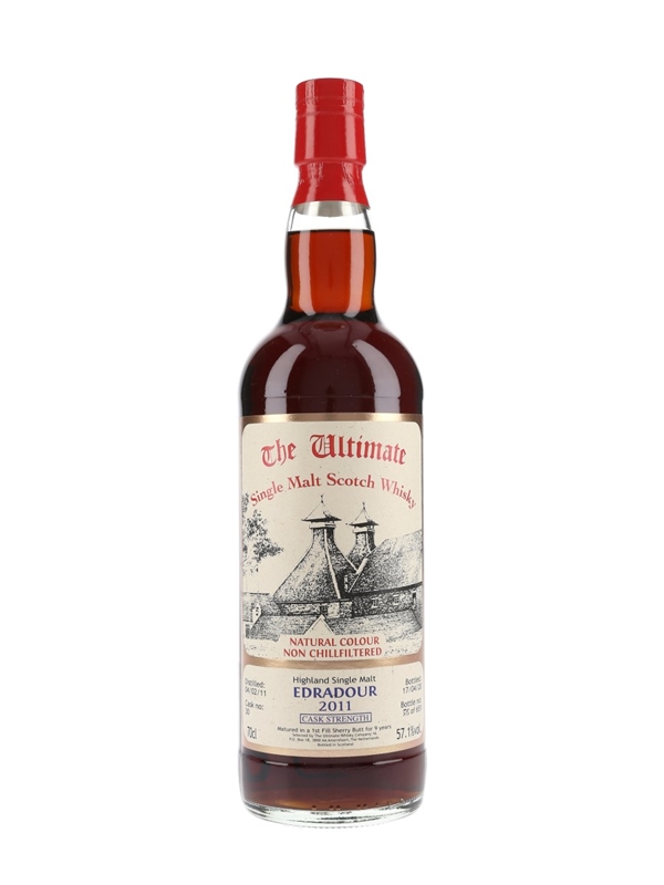 A bottle of Edradour 9 Year Old The Ultimate Single Malt Scotch Whisky. This was distilled on 4 February 2011, matured in a first fill sherry butt and bottled at cask strength on 17 April 2020 by The Ultimate Whisky Company.