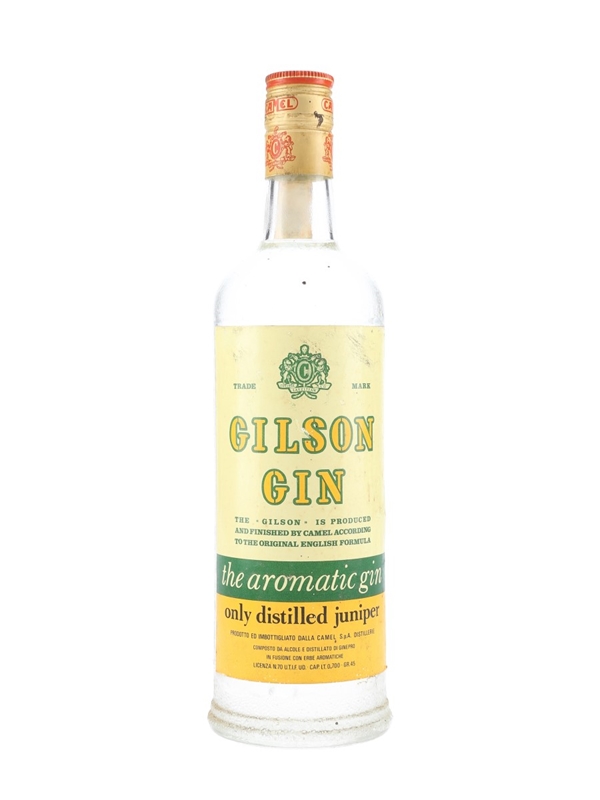 A bottle of Gilson gin produced in Italy according to the original English formula. This was distilled and bottled by Camel, we estimate in the 1980s.