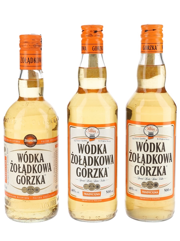 This lot contains three 50cl bottle of Żołądkowa Gorzka Special Herbs Bitter Vodka produced by Polmos.